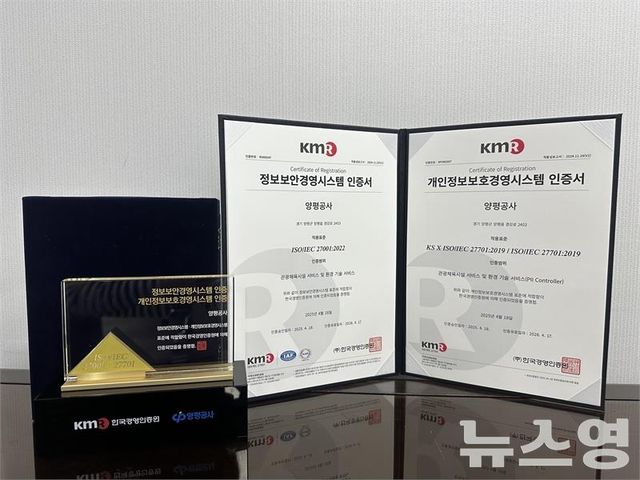 (뉴스영 이현정 기자) 양평공사는 지난 4월 18일 한국경영인증원(KMR)으로부터 정보 보안 경영시스템 국제표준 ‘ISO/IEC 27001’과 개인정보보호 경영시스템 국제표준 ‘ISO/IEC 27701’ 인증을 동시에 획득했다고 밝혔다.