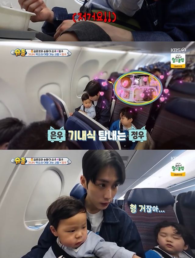 이어 은우와 정우를 위한 유아용 기내식도 따로 제공됐고, 정우는 "달걀이 있다. 밥이다. 고기다. 호박이다"라고 또 다른 기내식에 눈을 빛냈다.