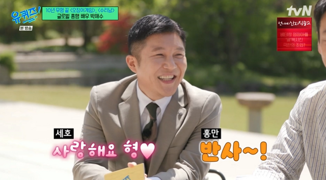 이날 박해수는 6년 전 ‘해피투게더’ 출연 이후 유재석과 조세호와 재회했다. 유재석이 “‘해투’에서 한석규와 최홍만 성대모사를 했었다”고 꺼냈고, 조세호가 “함께 했던 기억이”라고 거들었다.