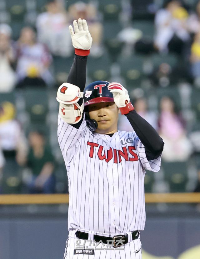 14일 오후 잠실야구장에서 열린 2025 프로야구 키움과 LG 경기. LG 오지환이 3회 1타점 좌중간 2루타를 날린뒤 기뻐하고있다. 잠실=정시종 기자 capa@edaily.co.kr