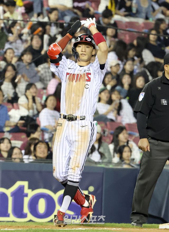 14일 오후 잠실야구장에서 열린 2025 프로야구 키움과 LG 경기. LG 박해민이 6회 2타점 우월 3루타를 날리고 기뻐하고있다. 잠실=정시종 기자 capa@edaily.co.kr