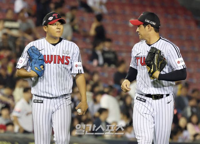 14일 오후 잠실야구장에서 열린 2025 프로야구 키움과 LG 경기. LG 선발 송승기가 5회 키움 카디네스를 유격수 플라이 아웃시키고 이닝을 마치고 들어오며 오지환의 격려를 받고있다. 잠실=정시종 기자 capa@edaily.co.kr