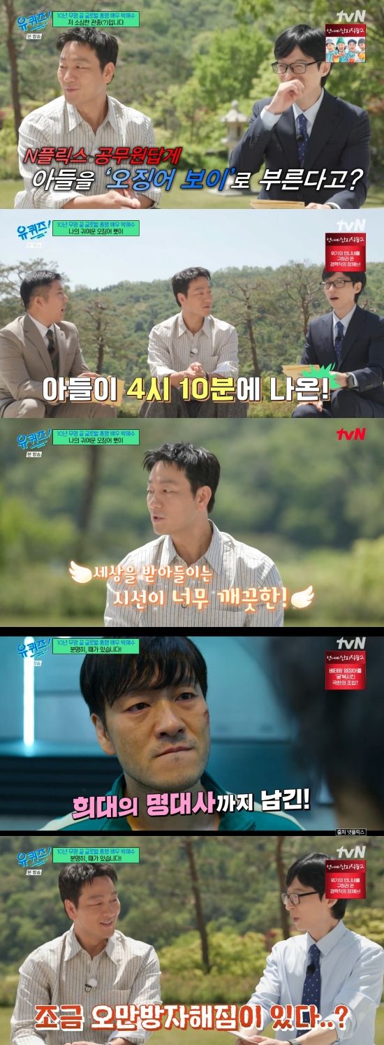 또 박해수는 아들을 오징어 보이라고 부르는 이유에 대해 "21년도 9월 17일 '오징어 게임' 나왔다. 오후 4시였다. 오픈이. 아들이 오후 4시 10분에 나왔다"라며 설명했다.