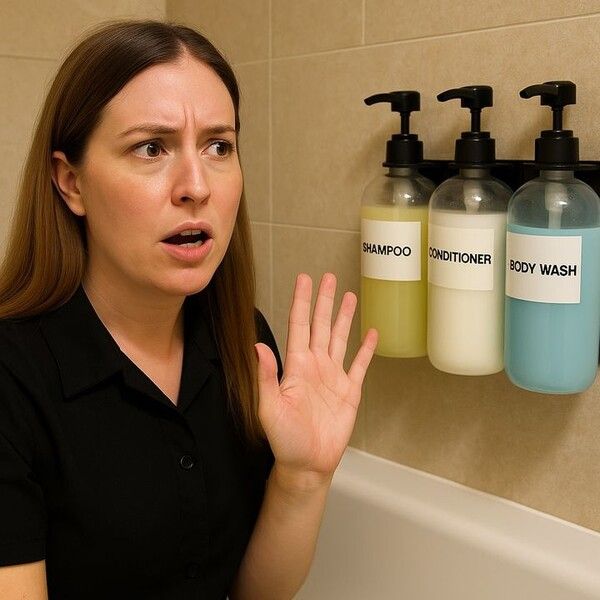 영상 속 한 호텔 직원은 객실 욕실에 비치된 대용량 샴푸, 컨디셔너, 바디워시를 가리키면서 "절대 이런 제품들을 사용하지 마세요"라고 경고한다.