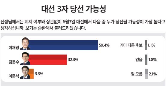 이번 대선 당선 가능성을 묻는 질문에서는 이재명 후보의 당선 예측이 59.4%로 가장 많았다. 김문수 후보는 32.3%, 이준석 후보는 3.3%였다. 잘 모름은 2.1%, 없음은 1.8%, 기타 후보는 1.1%다.