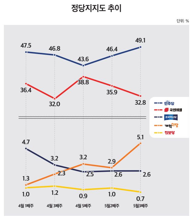정당 지지도는 더불어민주당이 49.1%로 25년 정당 지지도 중 최고 수치를 달성했다. 국민의힘은 대선 후보 단일화 갈등 여파로 전주대비 지지도가 3%p 떨어진 32.8%였다. 개혁신당은 국민의힘 단일화 갈등으로 인한 수혜를 입었다. 개혁신당 지지율은 그동안 지지율 2~3%대에 머물렀지만, 단일화 갈등이 이후에 5.1%까지 치솟았다.