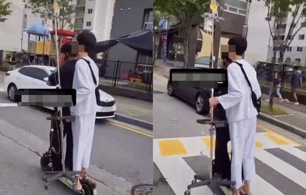 영상을 본 누리꾼들은 "환자 이송 중이냐" "서커스 하냐" "영상 찍은 사람도 한 손으로 킥보드 운전하면서 한 손으로 휴대전화 들고 있는 거 아니냐" "같은 병실에 입원하고 싶어서 그런가 보다" "진짜 멋지다고 생각하는 거냐. 아니면 아무 생각이 없는 거냐" 등 황당하다는 반응을 쏟아냈다.