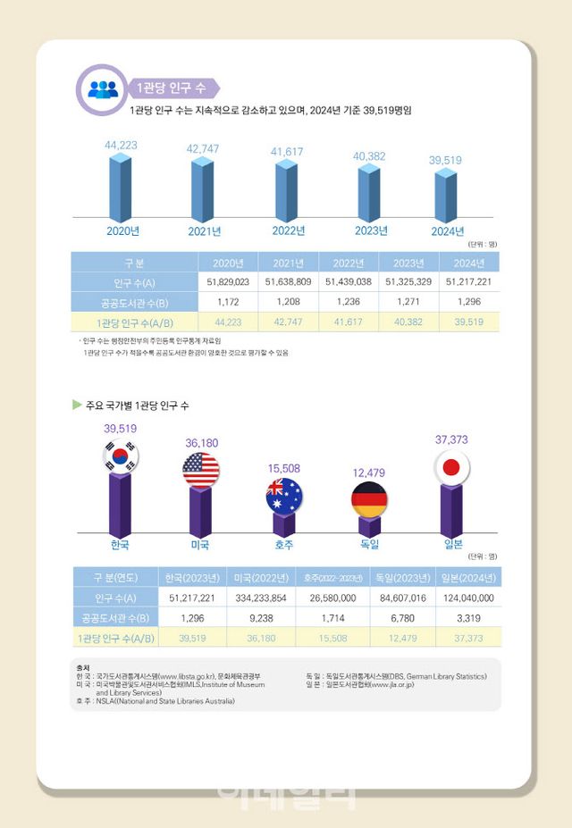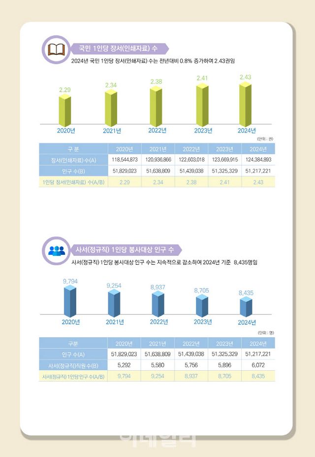 공공도서관 1관당 봉사 대상 인구는 3만 9519명으로 줄어들었다. 공공도서관의 양적 확충과 함께 국민의 도서관 접근성도 꾸준히 개선되고 있는 것으로 나타났다. 정규직 사서 수는 6072명으로 전년 대비 3.0% 증가했다. 정규 사서 1인당 봉사 대상 인구수는 8435명으로 도서관 전문인력 배치 여건도 점차 나아지는 추세로 파악됐다.