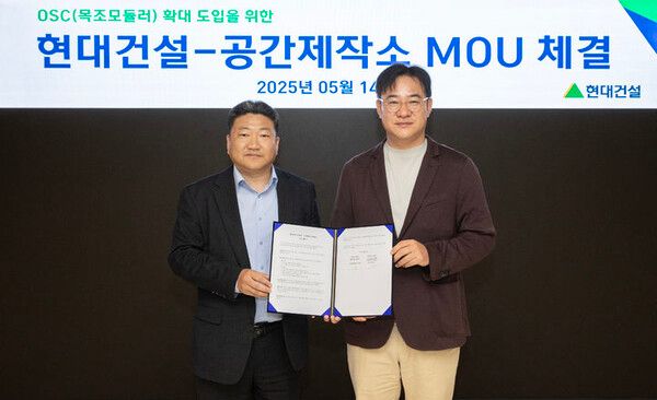 뉴시스 보도에 따르면, 현대건설은 지난 14일 서울 종로구 계동에 위치한 본사에서 공간제작소와 '목조 모듈러 기반 OSC(Off-Site Construction) 기술 확대 도입'을 위한 업무협약을 체결했다고 15일 밝혔다.