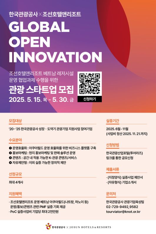 이번 업무협약은 국내 우수한 관광기업에 그들의 혁신적인 아이디어를 해외 시장에서 구현할 기회를 제공하고 관광기업의 성장을 돕고자 마련됐다. 양 기관의 첫 번째 협업사업은 조선호텔앤리조트에서 운영 중인 레저복합시설 ‘아쿠아필드’의 베트남 사업장에서 펼쳐질 예정이다. 공모를 통해 베트남 현지에서 글로벌 오픈이노베이션 프로그램에 참여할 관광기업 4개사를 선정하여 실증 기회를 제공한다. 또한, 공사는 최종 선정된 기업당 최대 2000만원의 사업화 자금을 지원할 계획이다.