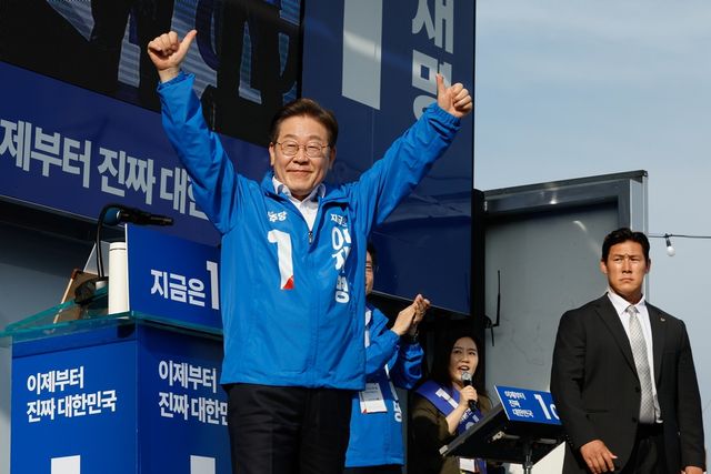 통영 시민들 향해 인사하는 이재명 더불어민주당 대통령 후보 / 뉴스1