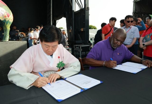 | ▲ 박범인 금산군수 미국 멤피스 인 메이 국제 페스티벌 참가 및 양해각서 체결 모습 |