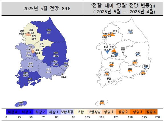 한편 5월 전국 자금조달지수는 전월대비 1.3포인트 하락한 79.3, 자재수급지수는 3.3포인트 상승한 96.2로 전망됐다.
