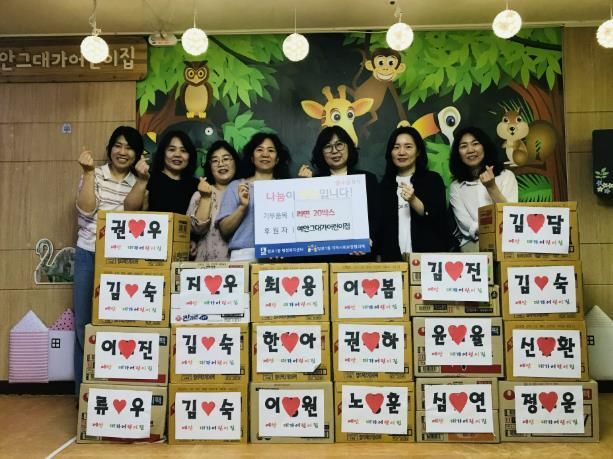예안그대가어린이집은 2010년 12월 개원한 이후부터 지속적으로 지역의 어려운 이웃을 위해 다양한 생필품을 후원하고 있으며, 이날 후원한 라면은 원아들이 사용하지 않는 물건이나 장난감, 책을 기부하고 판매한 '아나바다 장터놀이'활동을 통해 발생한 수익금으로 마련한 후원 물품이다.