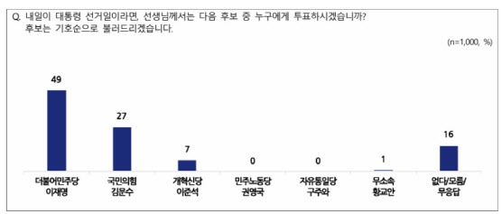 대선 후보 호감도 조사에서도 이재명 후보는 비교적 높은 수치를 보였다. 각 후보에 대해 호감이 가는지를 묻는 질문에 이 후보는 50%, 김 후보는 30%, 이준석 후보는 22%로 응답됐다.