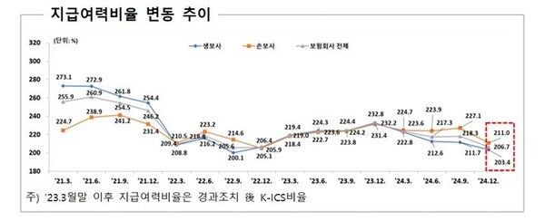 뉴시스 보도에 따르면, 15일 금융감독원에 따르면 경과조치를 적용하기로 한 19개 보험회사의 작년 12월말 킥스는 206.7%로 전분기말(218.3%) 대비 11.6%p 감소했다. 킥스는 가용자본에서 요구자본을 나눈 값을 말한다.
