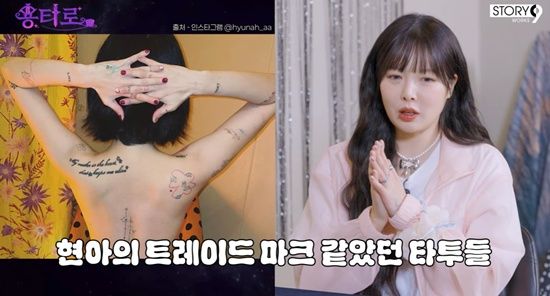 현아는 지난 14일 웹예능 '용타로'에 출연해 "타투를 지운 지 1년 정도 됐다"고 해 눈길을 끌었다. 그는 "전신에 타투가 많이 있었는데 (제거하려니) 시간이 많이 들더라"라고 고백했다.