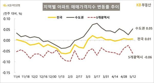 뉴시스 보도에 따르면, KB국민은행 KB부동산이 15일 발표한 주간 아파트시장동향에 따르면 지난 12일 기준 전국 아파트 매매가격은 전주 대비 0.01%, 수도권은 0.05% 상승했다. 전국 아파트 매매가격은 3월 셋째 주부터 0.00~0.01%의 변동률을 나타내며 보합권에서 움직이는 상황이다.