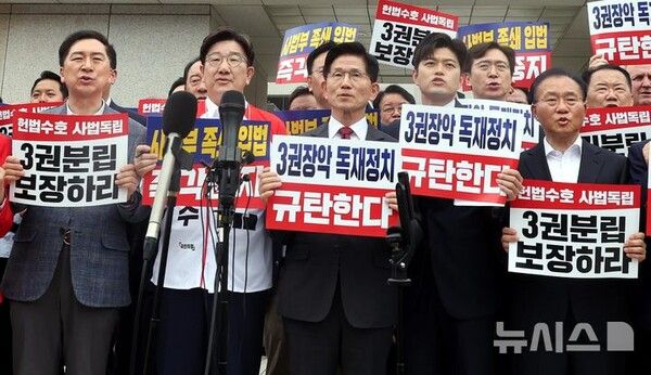 이어 "조희대 대법원장과 전국 법관들에 호소한다. 법관의 긍지와 명예를 지키고 사법부 독립성을 꿋꿋이 지켜서 대한민국 민주주의를 반드시 수호해주시기를 바란다"며 "국민 여러분도 국민의힘과 함께 민주당 독재를 막고 이 땅의 민주주의를 수호하고, 이 땅의 국민 인권을 지키기 위해 함께 해줄 것을 호소 드린다"고 했다.