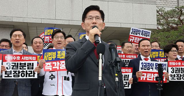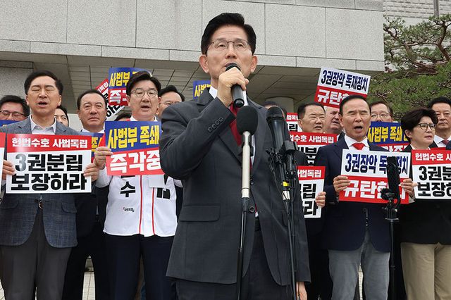 같은 자리에서 권성동 원내대표는 “이재명 세력이 자신에게 불리한 판결을 내린 판사에게 보복을 가하고 있다”며 “이건 조폭이나 깡패가 하는 짓이다. 대법원장과 전국 법관에게 호소한다. 명예와 독립성을 지켜 민주주의를 지켜 달라”고 말했다.