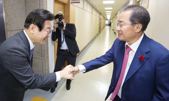악수하는 이재명 전 더불어민주당 대표와 홍준표 전 대구시장. 기사 이해를 돕기 위한 자료 사진 / 뉴스1