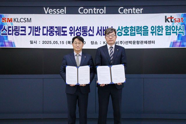 이날 KT SAT과 KLCSM 양사는 부산 중구 KLCSM 본사에서 MOU를 체결하고 무궁화위성(정지궤도)과 스타링크(저궤도)를 결합해 제공하는 ‘다중 궤도(Multi-orbit) 위성 서비스’를 활용한 해양 디지털 전환 가속화에 적극 협업하기로 약속했다.