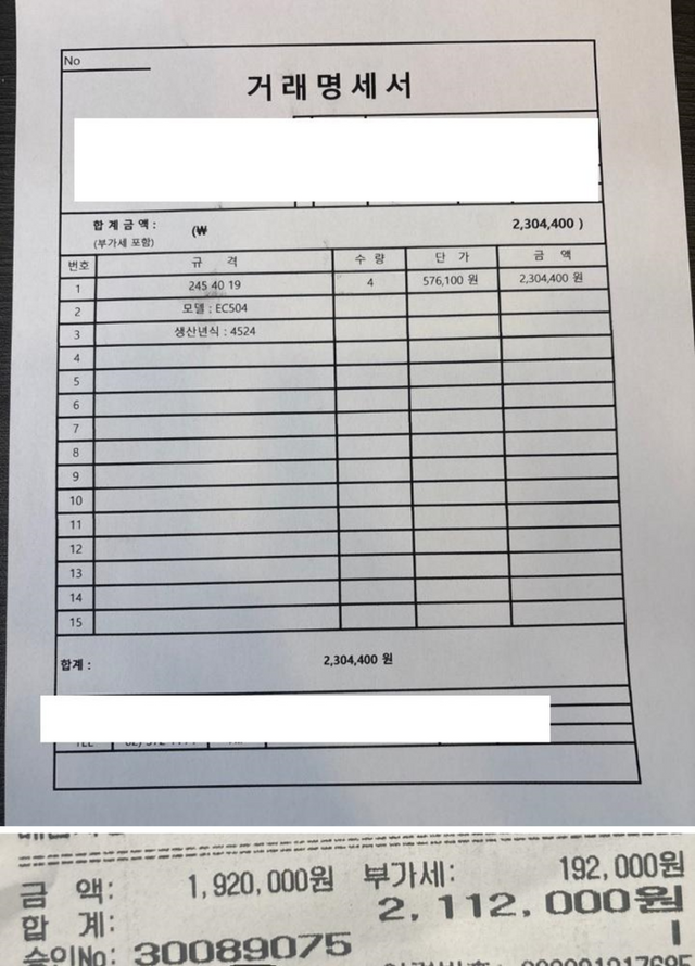 타이어 교체가 처음이었던 A씨는 B사가 추천해준 2024년식 던롭 에너세이브 EC504 (245/40/R19) 4짝을 공임 포함 총 211만2000원에 교체했다.