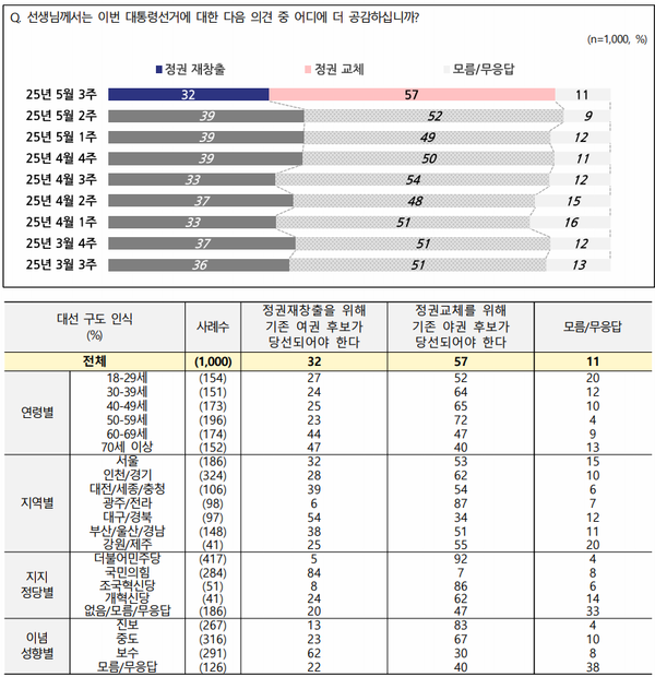 차기 대선에서 정권 교체를 위해 기존 야권 후보가 당선돼야 한다는 응답은 57%, 정권 재창출을 위해 기존 여권 후보가 당선돼야 한다는 응답은 32%로 나타났다.