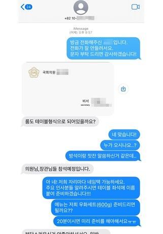 명함을 첨부해 식당 주인을 안심시킨 뒤 '의원님, 장관님들 포함 20명이 참석 예정'이라며 예약을 진행했다.