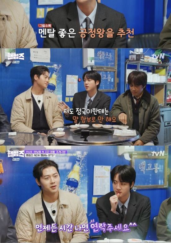 이날 진은 게스트로 출연한 이유에 대해 "제가 이번에 앨범 프로그램 여러 개 도는데 정해야 되지 않냐. 어디를 나갈지. '핸썸가이즈' 우선으로 꼭 넣어달라고 했다. 첫 회부터 같이 하지 않았냐. 여기만큼 마음 편한 데가 없다"라며 프로그램을 향한 애정을 과시했다.