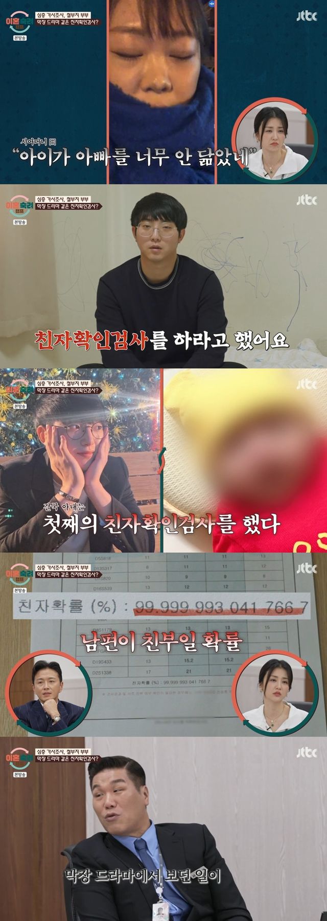 결국 첫째 아이에 대한 검사가 진행됐다. 검사 결과 남편이 친부로 확인됐지만 아내는 큰 상처를 받았다. 이를 들은 서장훈은 "이건 드라마에서나 보던 이야기인데..."라며 황당함을 감추지 못했다.