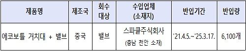회수 대상은 ‘스파클주식회사(충남 천안 소재)’가 판매한 ‘에코보틀 거치대 +밸브’ 제품의 식품용 기구인 ‘밸브’이다.