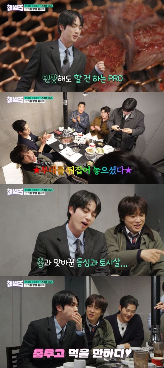 진은 "그럼 해야지"라며 BTS의 '다이너마이트(Dynamite)' 안무를 선보였다. 차태현은 "이게 대단한 고기다. 이 집은 난리 나겠다"라며 감탄했고, 진은 고기를 먹고 "춤추고 먹을 만하다"라며 기뻐했다.