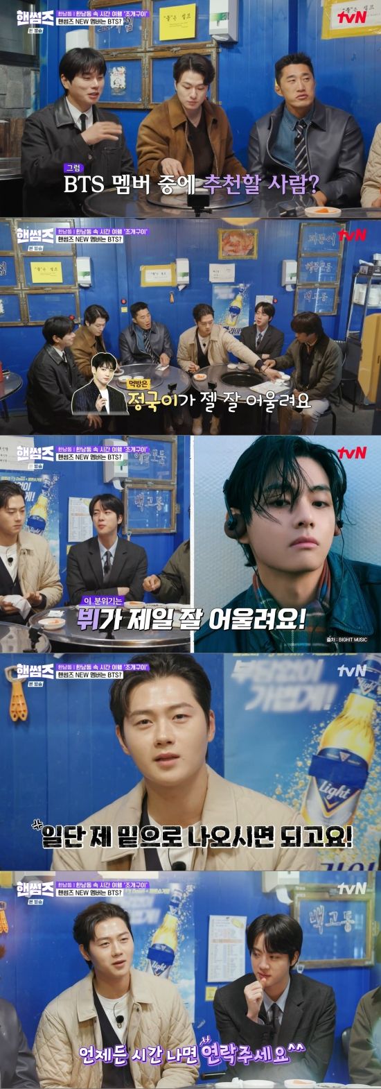 15일 방송된 tvN '핸썸가이즈'(이하 '핸썸즈')에서는 진이 게스트로 출연한 가운데 프로그램에 어울리는 멤버로 정국과 뷔를 언급한 장면이 전파를 탔다.