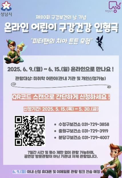 [와이뉴스] 성남시 오는 5월 30일까지 온라인 구강 건강 인형극 ‘피터팬의 치아 튼튼 모험’ 공연 관람 신청을 받는다.