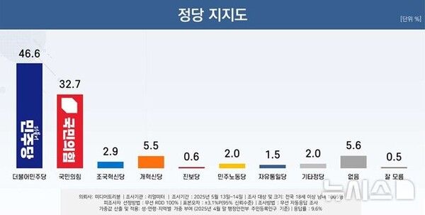 정당 지지도에서 더불어민주당이 46.6%, 국민의힘이 32.7%를 기록했다는 여론조사 결과가 16일 나왔다.