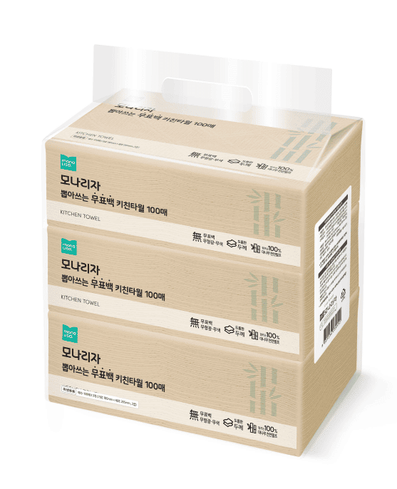 ㈜모나리자가 100% 대나무 천연펄프를 사용한 '뽑아쓰는 무표백 키친타월'을 출시했다고 밝혔다. 오는 18일부터 24일까지 쿠팡에서 사전 예약을 진행한다.