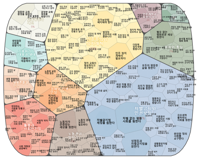 시민들이 바라는 새로운 세상은 과연 어떤 세상일까. 윤석열 퇴진 집회를 주도했던 '내란청·사회대개혁 비상행동'은 지난 2월 10일부터 3월 6일까지 온라인을 통해 시민들이 바라는 사회대개혁 과제들을 분석했다. 그 결과, '차별금지와 인권보장' 31%, '민주주의와 정치개혁' 23%, '돌봄과 사회안전망' 8%, '노동권과 일자리' 7%, '평화와 통일' 7%, '기후위기 대응' 7%, '경제와 민생 안정' 6%, '교육' 5%, '생명존중’ 4%' 순으로 나타났다.