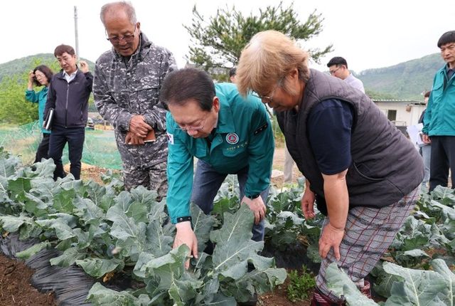 농가를 방문한 송 군수는 갑자기 쏟아진 우박에 큰 상처를 입어 정상 출하를 포기해야 하는 브로콜리 등 작물 상황을 직접 살폈다.