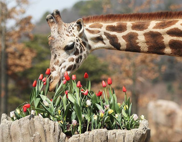동물원에서 튤립 향기를 맡는 기린 모습. 기사 이해를 돕기 위한 자료 사진 / 연합뉴스