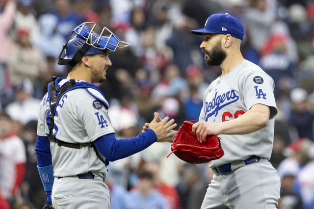 Los Angeles Dodgers catcher Austin Barnes, left, and closing pitcher Tanner Scott, right, celebrate after their team defeated the Philadelphia Phillies in a baseball game, Saturday, April 5, 2025, in Philadelphia. (AP Photo/Laurence Kesterson)/2025-04-06 08:01:09/