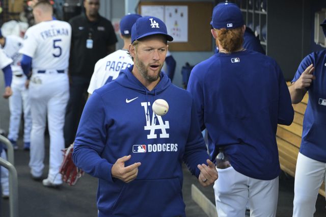 Los Angeles Dodgers' Clayton Kershaw tosses a ball as he walks through the dugout early in a baseball game against the Oakland Athletics, Wednesday, May 14, 2025, in Los Angeles. (AP Photo/Jayne Kamin-Oncea)/2025-05-15 13:29:31/