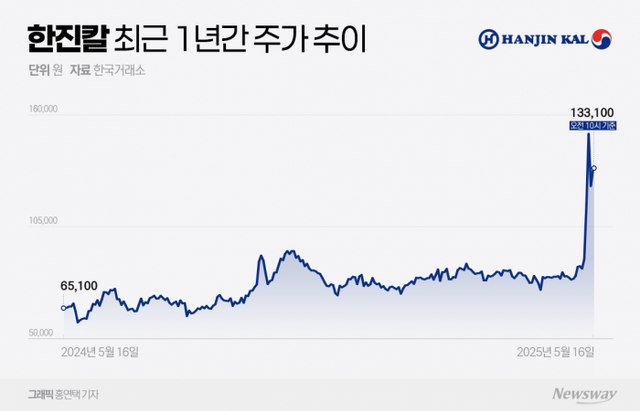 16일 한국거래소에 따르면 오전 11시 기준 한진칼 주가는 전 거래일 대비 3.36%(4100원) 오른 12만9200원에 거래되고 있다. 지난 13~14일 연이틀 상한가를 기록하며 52주 최고가인 16만500원을 찍었으나 전날에는 22.12% 하락해 12만5000원에 마감했다.