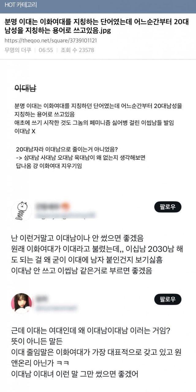 “이대남”은 이화여대를 견제(?)하기 위해 만들어진 낱말