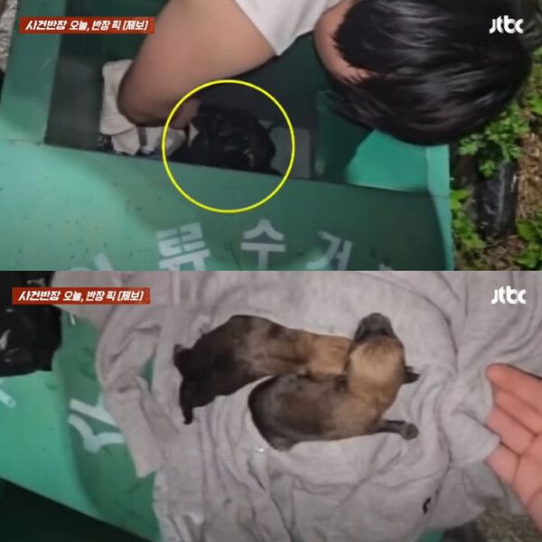 뉴시스 보도에 따르면, 15일 JTBC '사건반장'에 따르면 이날 오전 3시께 서울 강북구의 한 아파트 단지에서 반려견과 산책 중이던 제보자 A씨가 의류 수거함 안에서 강아지를 구조했다.