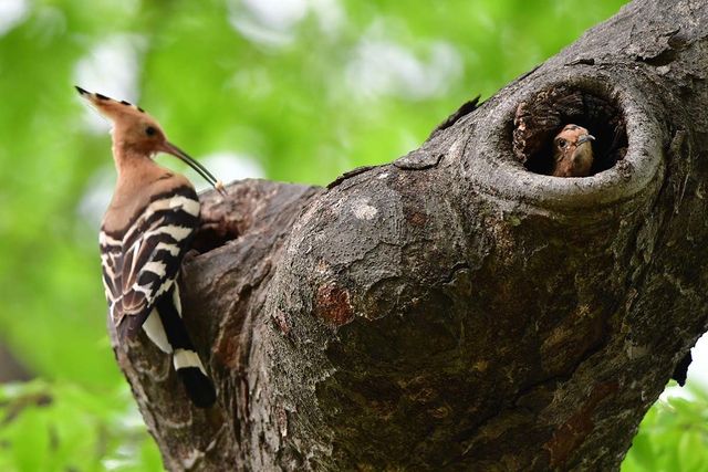 가정의 달 5월 첫 날인 1일 경북 경주시 황성공원 고목에 둥지를 튼 후투티 한쌍이 새끼들에게 먹잇감을 물어다 나르고 있다. / 뉴스1(2025.5.1)