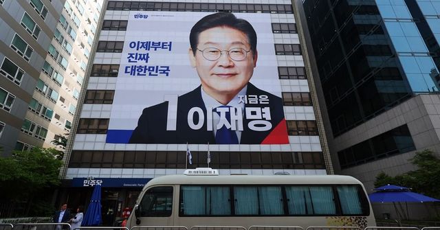 13일 오전 서울 영등포구 여의도 더불어민주당 당사에 이재명 제21대 대통령 후보의 대형 현수막이 걸려 있다. / 뉴스1