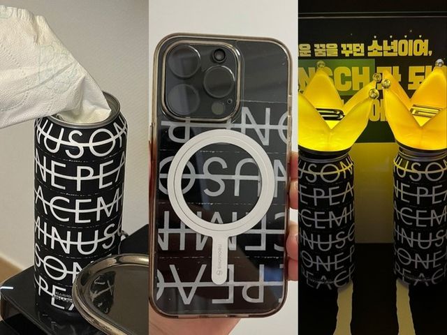 '피스마이너스원 하이볼' 캔을 재활용해 만든 (왼쪽부터) 휴지 케이스, 핸드폰 케이스, 응원봉 보관함. ⓒ SNS 캡쳐