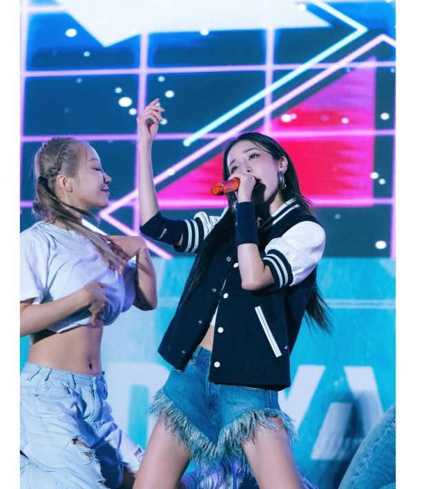 산다라박은 짧은 언밸런스 쇼츠와 더불어 독특한 상의를 착용해 눈길을 끈다. 특히 산다라박의 복근이 시선을 사로잡는다.