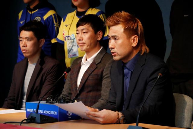 전 축구 국가대표 김병지가 2018년 서울 마포구 상암월드컵경기장에서 아산무궁화 축구단 선수수급 중단 사태 관련 기자회견을 갖고 있다. / 뉴스1